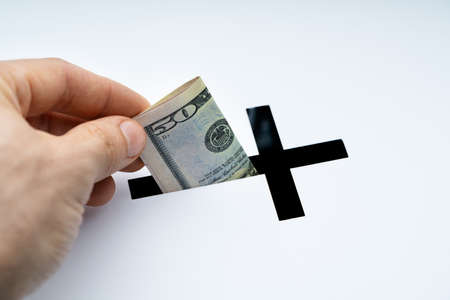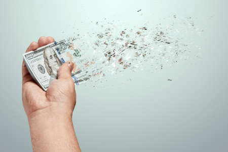 A hand holds a hundred dollar bills that dissolve into thin air. The concept of big expenses, loans, mortgages, big purchases