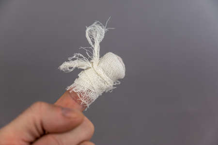 The hand of a mature man with a bandaged index finger. The man holds his palm against the gray background. Health and Medicine.