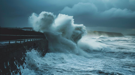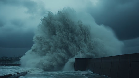 A breathtaking view of powerful ocean waves crashing against a seawall, with dark storm clouds overhead, capturing the awe-inspiring force of nature in a coastal setting.