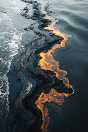 An unusual orange substance winds through the dark waters along a coastal area at dawn. The contrast between the vivid color and the surrounding dark environment creates a striking visual effect, capturing attention.