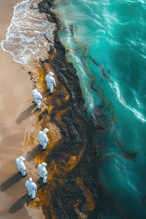 A group of individuals in protective white suits walks along the shoreline, examining the damage caused by oil pollution. They are working to clean up the beach while waves gently lap at the sand.