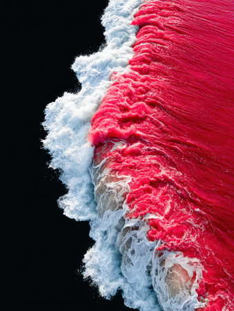 A breathtaking view of vibrant red waves colliding with a dark ocean surface captures the energy of the moment. The contrast highlights the natural beauty during twilight, evoking powerful emotions.