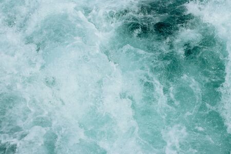 Blue waves of water of the river and the sea meet each other during high tide and low tide. Whirlpools of the maelstrom of Saltstraumen, Nordland, Norway.