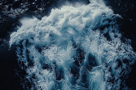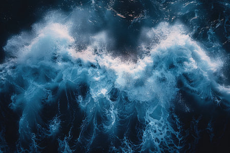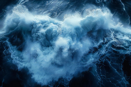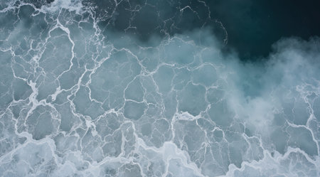 An impressive overhead shot that beautifully captures the dynamic and intricate patterns of ocean waves and their foam