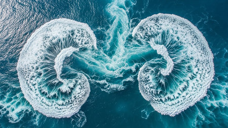 An aerial perspective captures the dynamic movement of turquoise ocean water forming symmetrical white foam patterns resembling a kidney shape.