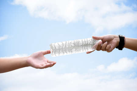 two hands of human sending and receiving the empty plastic drinking water bottle with cloudy bluesky background. concept for helping to reduce using plastic bottles to save the environment.