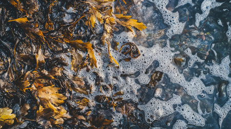 A variety of seaweed rests on rocky seabed, adorned with bubbles and foam from the waves. The rich colors contrast with the clear water during a calm moment.