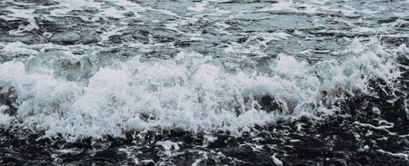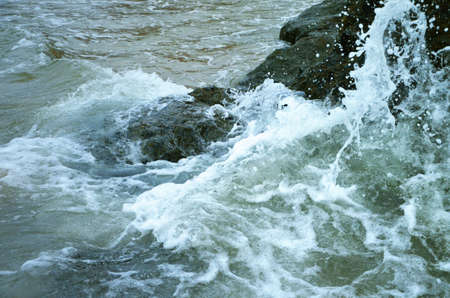 Sea waves breaking on a stony shore, forming sprays and splashes