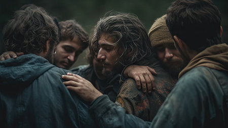 Group therapy and support - middle aged men and women hug, supporting each other during psychological practice. The healing power of hugs creates a safe space for members.