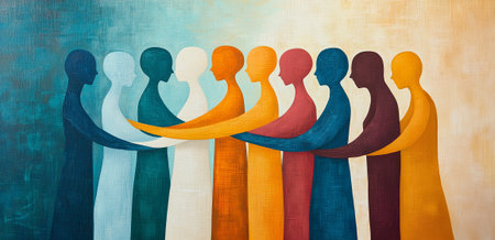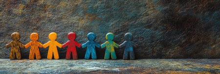 This vibrant image symbolizes diversity, showcasing colorful figures joyfully holding hands, creating a warm atmosphere of unity and harmony among individuals from various backgrounds