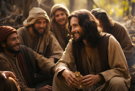 In serene tableau, Jesus Christ and disciples gather, radiating divine harmony. Scene captures essence of spiritual teachings and the sacred camaraderie among these central figures of Christian faith