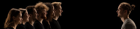 Side view portraits of different people smiling to young man over dark background. Social influence. Banner. Concept of human right, freedom, diversity