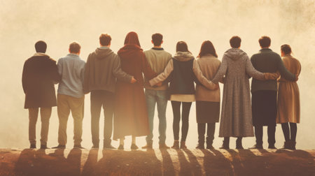 over the shoulder shot of a group of people standing together outside, created with generative ai