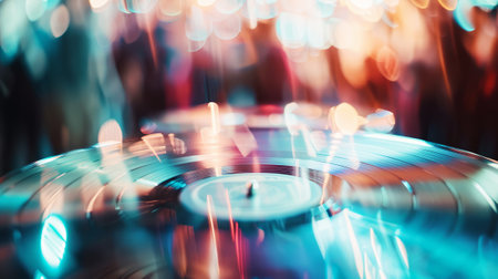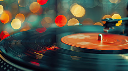 Retro vibe captured with a spinning record on a turntable, framed by glowing, vibrant bokeh lights in warm hues.