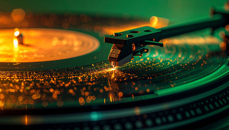 In a room filled with the warm glow of green and orange lights, a diamond stylus traces the intricate grooves of a classic vinyl record. Each speck of dust catches the light, telling a story of countless plays and cherished memories as rich, analog sound fills the air.