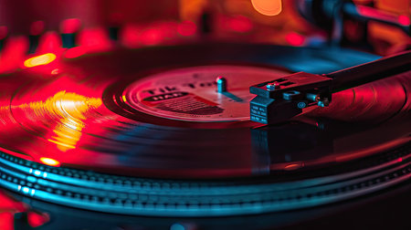 Close-up of a vintage vinyl record spinning on a turntable, capturing the nostalgia and warmth of analog music playback. The image highlights the grooves and red label of the record.
