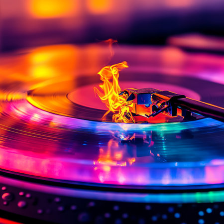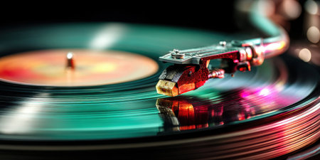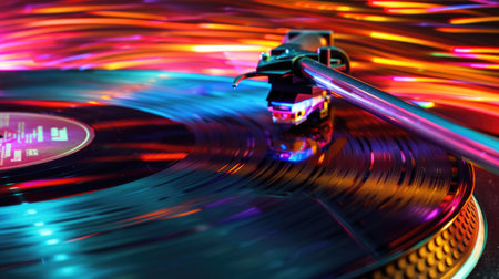 A close-up view of a turntable with a needle on a spinning vinyl record showcases vibrant colors and reflections, creating a perfect atmosphere for music lovers.