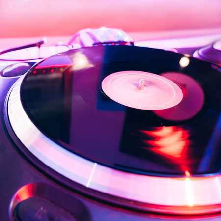 Vinyl DJ turntable in club lighting. close-up. pink tint. retro style