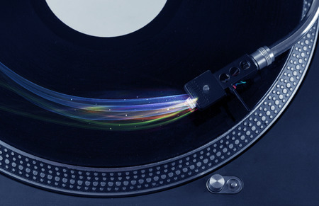 Black DJ turntable with colorful light trails spinning above it, creating a motion-filled long exposure shot