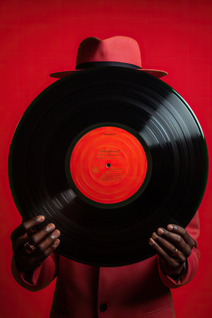 African American man hand holding old retro vinyl record