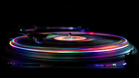Vinyl record spinning on a turntable under colorful lights
