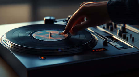 A close-up captures a person's hands manipulating a vinyl record on a turntable. The scene showcases a vintage or modern music setup, possibly indoors. The composition features shallow depth of field, with soft focus on some areas. This image is suited for illustrating music-related themes.