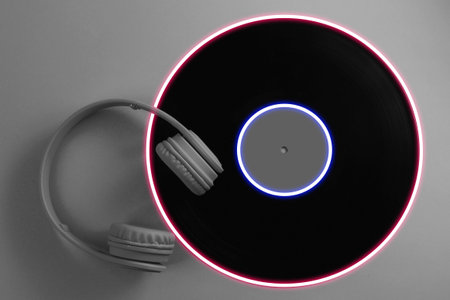 Stereo headphones with a vinyl record. Neon, holographic light. gradient violet-green glow. Retro wave. Top view