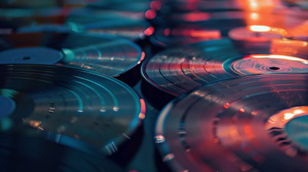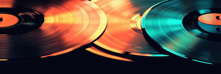 Colorful reflections highlight vintage vinyl records arranged in a dynamic way, leaving ample space for adding personal text or messages.