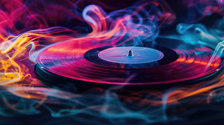 Vinyl record spinning on a turntable background with smoke in neon colors. Music, DJ concept banner