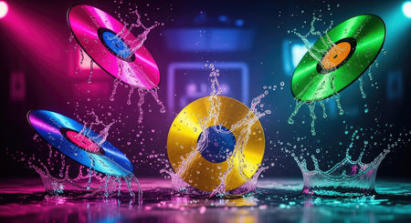 Four vinyl records are suspended, surrounded by water splashing outwards. Bright pink, blue, yellow, and green discs contrast against a dark background. Water droplets create dynamic shapes, enhanced by neon lighting. Ideal for creative projects, this image could be used for advertising or artistic purposes.