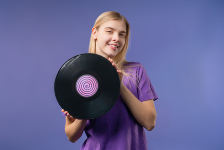 Woman holding vinyl record. Music passion. Listening to music from analog record. Playing music from analog disk on turntable player. Enjoying music from old collection. Retro and vintage. Stereo audio. Analog sound