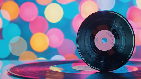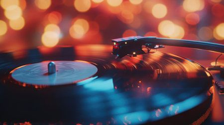 Retro vibe captured with a spinning record on a turntable, framed by glowing, vibrant bokeh lights in warm hues.