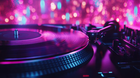 Vinyl DJ turntable in club lighting. close-up. pink tint. retro style