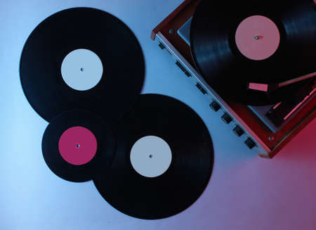 Retro vinyl record player. Vinyl records. Neon light, top view