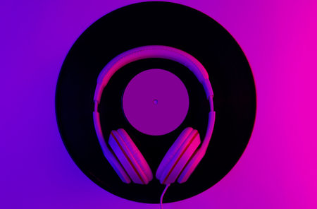 Retro style music concept. Classic headphones, vinyl record with gradient pink-purple neon light. Pop culture. 80s. Top view