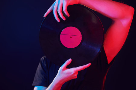 robotics dj man with metal hand nostalgia about past time in neon studio feeling loneliness hold disc for vinyl record