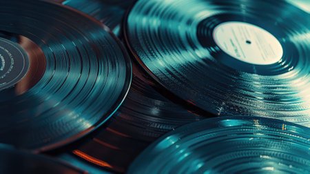 A collection of vintage vinyl records displayed in 3D, capturing their unique grooves and inviting colors. Ideal for creative projects or marketing.