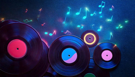Vinyl records are artistically displayed on a dark backdrop with glowing musical notes above.