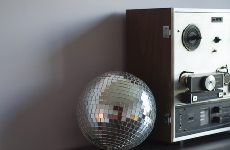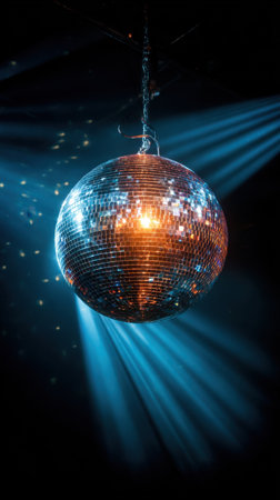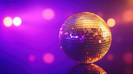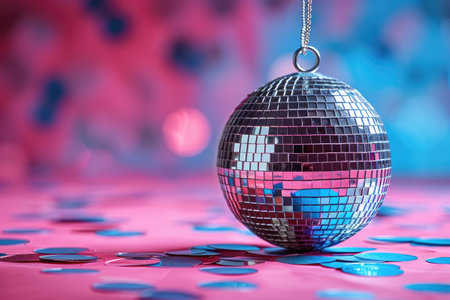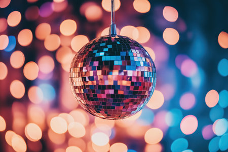 A close-up of a shimmering disco ball reflecting colorful lights, creating a retro party atmosphere