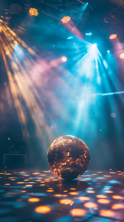 Classic disco ball casting colorful reflections on a dance floor in a nightclub, creating a vibrant and festive atmosphere