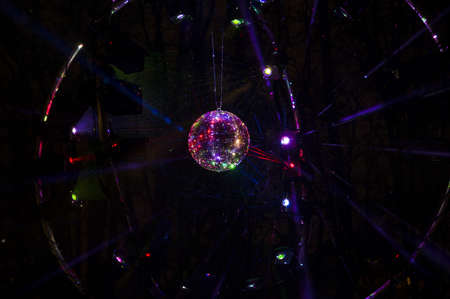 Colorful disco mirror ball lights night club background. Party lights disco ball. Selective focus
