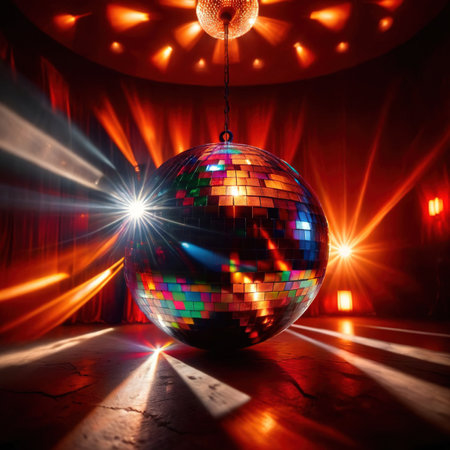 Bright light reflects off a glittering disco ball, surrounded by a captivating blend of colors that enhance the energetic vibe during a dark disco and italo disco mix night environment.
