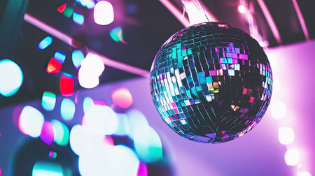 Classic disco ball hanging in a party environment, reflecting colorful lights and creating a festive atmosphere