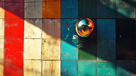 A beautiful disco ball reflects light in a vibrant space filled with colorful tiles. The intricate patterns of the wall enhance the festive atmosphere creating a lively vibe.