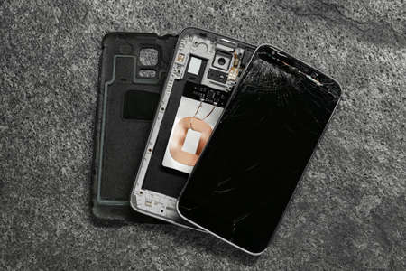 Damaged smartphone on gray background, flat lay. Device repairing