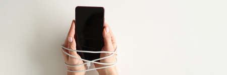 Hands are tied with wire and hold smartphone