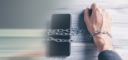 phone with hands addiction on a wooden background