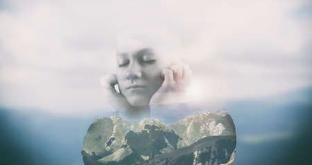 two exposures, harmony of people and nature, finding oneself, portrait of a woman, banner with copy space made with Generative AI
