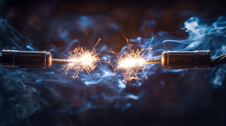 Two cables creating a spark against a dark smokey background symbolizing connection and energy transfer.