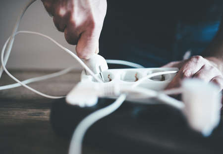 Closeup of a mans hand inserting a plug into electrical power strip.